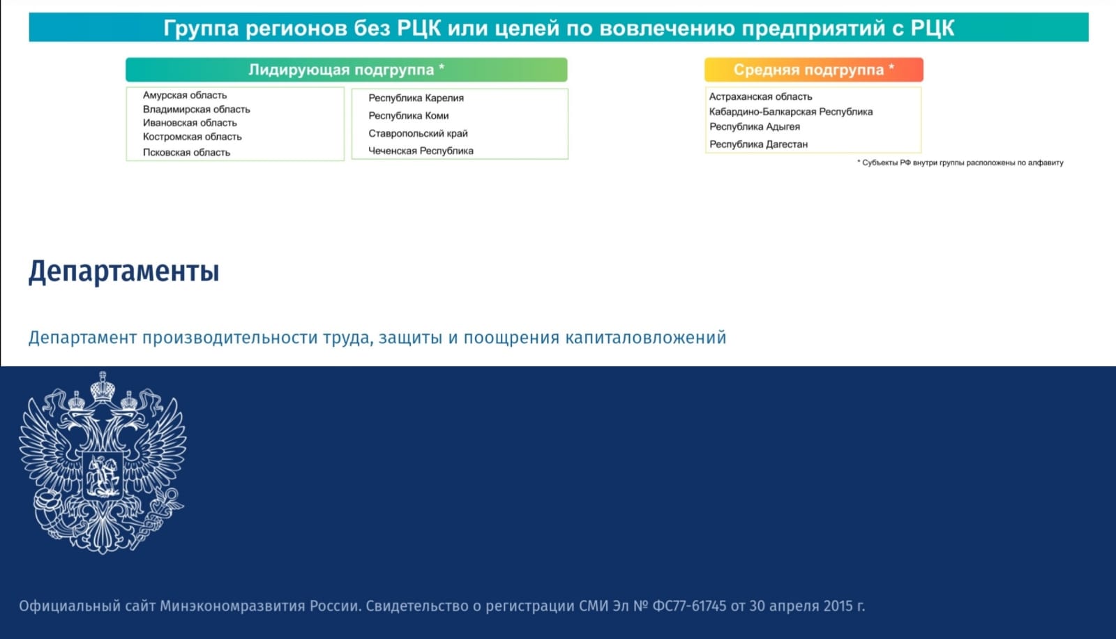 В итоговом рейтинге учитывался уровень достижения целей в части прироста производительности труда на предприятиях-участниках из расчетов ФНС, а также дополнительный вклад субъектов РФ в достижение прироста производительности труда на федеральном уровне.